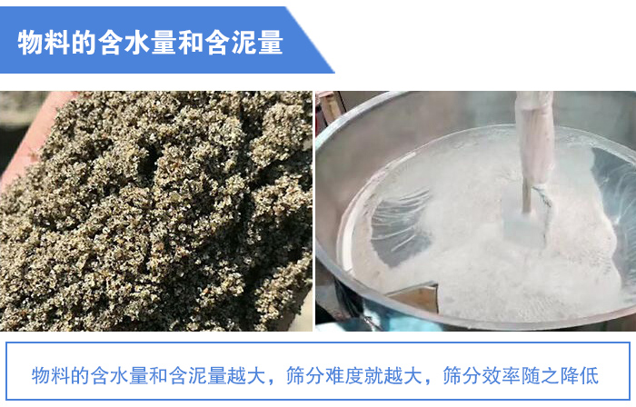 如果物料中包含的表面水分在一定程度內(nèi)增加,那它的粘滯性就會(huì)增大,造成細(xì)粒互相粘結(jié)成團(tuán),并附著在大顆粒上;同時(shí)還有物料中包含的粘性物質(zhì),很容易把篩孔堵住。這些都大大降低了篩分效率。