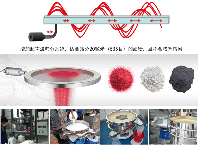 超聲波振動(dòng)篩在普通篩機(jī)基礎(chǔ)上增加超聲波篩分裝置,超聲波振動(dòng)篩振頻可達(dá)3.6萬(wàn)次/秒,適合篩0-625目精細(xì)粉末,產(chǎn)量可提高0.5-10倍.