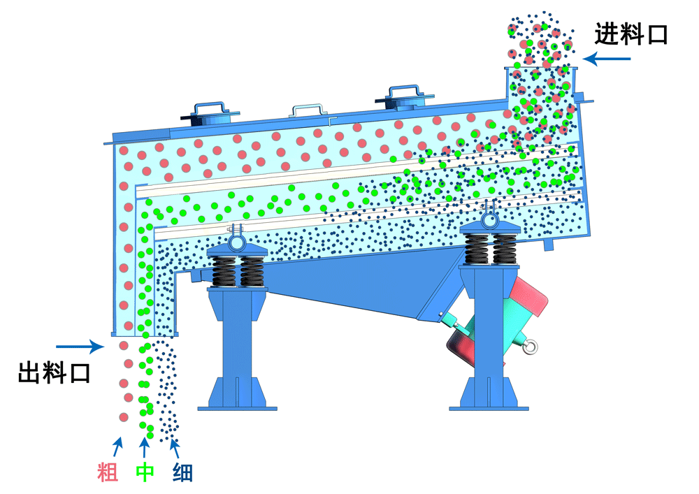 標(biāo)準(zhǔn)的振動(dòng)篩分機(jī)設(shè)備工作原理是利用振動(dòng)原理來(lái)實(shí)現(xiàn)不同物料分級(jí)或篩選,通過(guò)振動(dòng)源帶動(dòng)篩箱運(yùn)動(dòng),使物料在篩面上做定向運(yùn)動(dòng),依據(jù)顆粒大小差異透過(guò)不同孔徑的篩網(wǎng),從而完成物料的分離與提純。根據(jù)振動(dòng)篩分機(jī)設(shè)備的工作原理,制造設(shè)備的型號(hào)也不同。