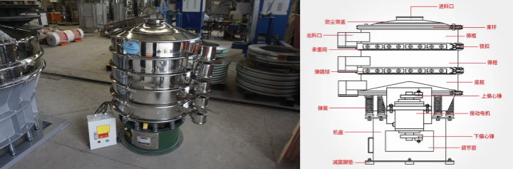 五層旋振篩:采用立式振動電機驅動,篩體做三維立體振動,物料在篩面上呈螺旋狀擴散運動。五層篩網可靈活配置 20-400目不同孔徑,可以添加超聲波系統能夠輕松應對超細粉末篩分,密封性能優異,能有效防止粉塵外泄。