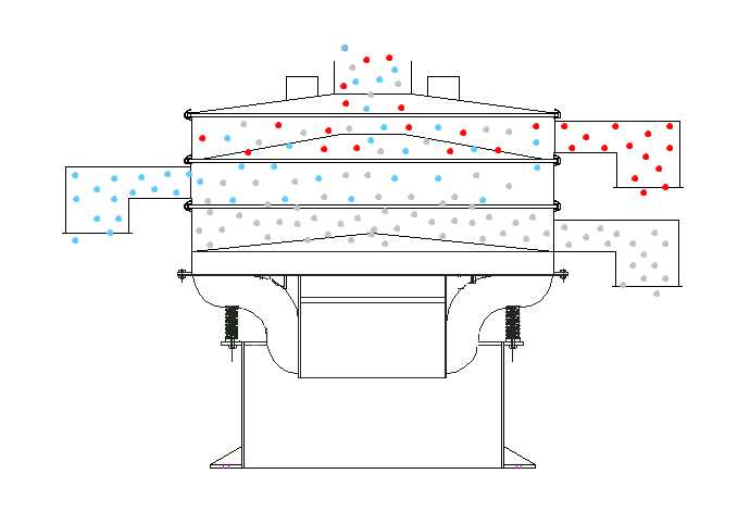 五層振動篩的工作原理基于振動分散+多層篩選的協同模式。當物料從頂部進料口進入篩箱后,振動電機啟動產生高頻振動,帶動五層篩網同步做三維運動。物料在振動作用下沿篩面均勻擴散,依次經過五層篩網的逐級篩選:粒徑最大的粗顆粒被最上層篩網攔截,從對應粗料出料口排出;符合該層級篩網孔徑的物料則透過篩網,進入下一層級繼續篩選;依此類推,經過五層篩網的精準分離,最終從底部出料口排出最細級別的物料。
